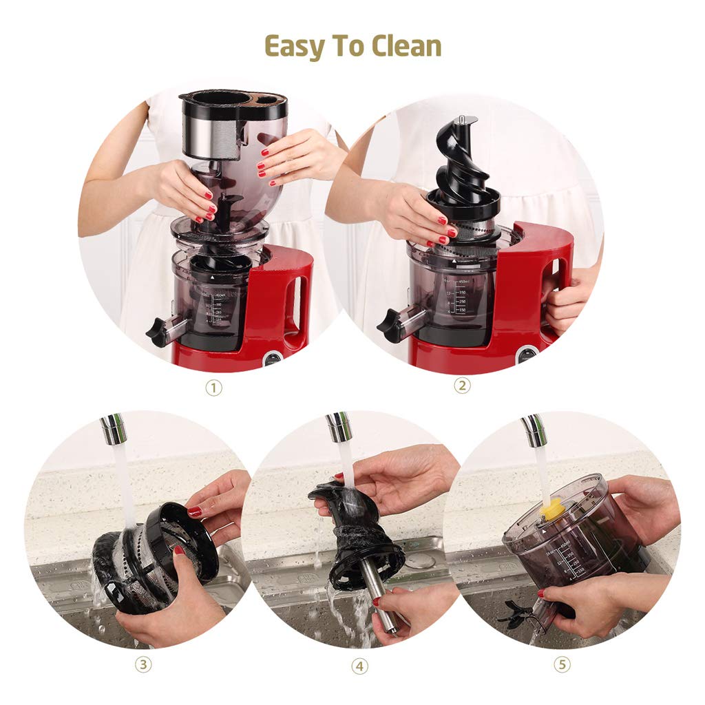 Cold Press Juicer is designed to extract delicious and nutritious juice from whole fruits and vegetables, making it ideal for health enthusiasts and busy families. Its impressive 5.8-inch wide feed chute allows users to juice without the hassle of chopping, catering to those who value convenience and efficiency. This juicer features a robust 400W motor, ensuring high juice yield while maintaining the integrity of the nutrients.